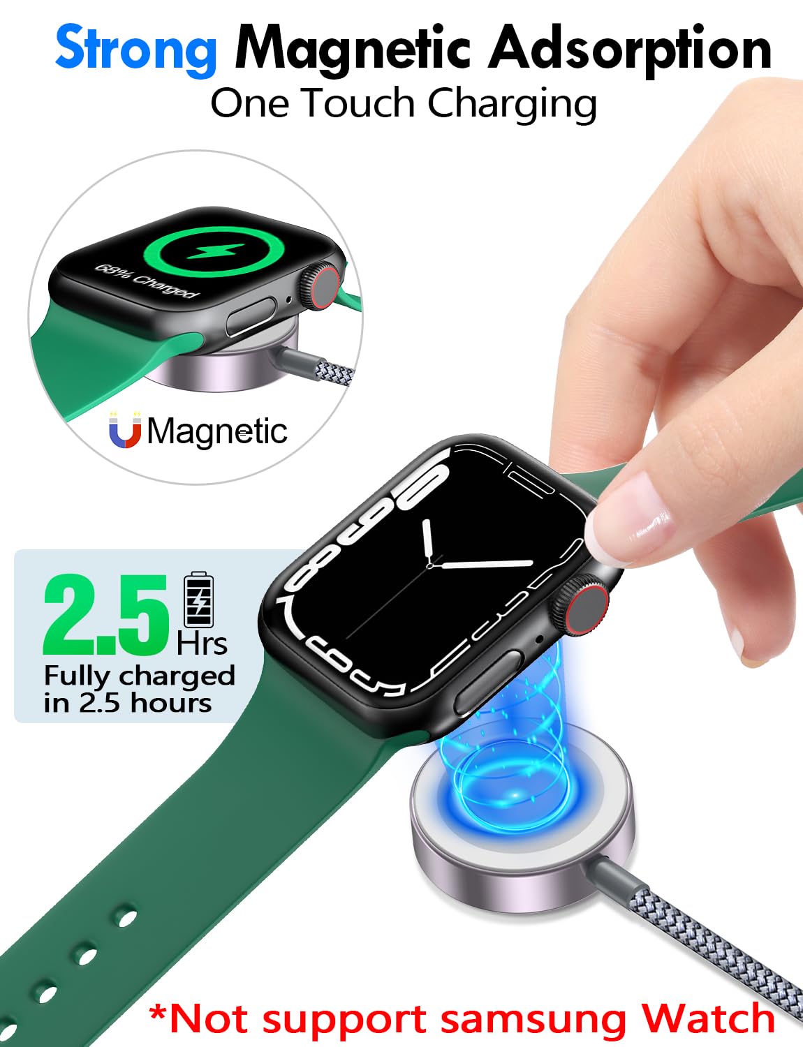 【Strong Magnetic Adsorption】The iWatch Charger with built-in magnet has strong adsorption perfectly snaps and centers to the charging coil on the back of your watch,stable and will not fall off,you will get wonderful charging experience(Note: no iwatch case for better charging speed).