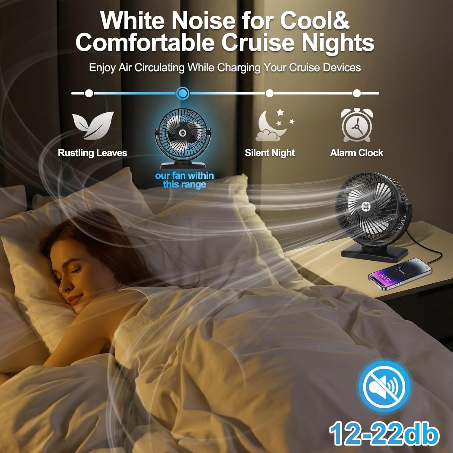 【360° Adjustable Rotation & Stable Stand】: Enjoy full directional control with a smooth 360° pivot and a sturdy stand for versatile placement — from bedside cooling, to wall/ceiling-mounted circulation, offering flexible options to enjoy cool and comfortable cruise nights. This fan is a cruise must-have during hot summer days or stuffy indoor cabins.