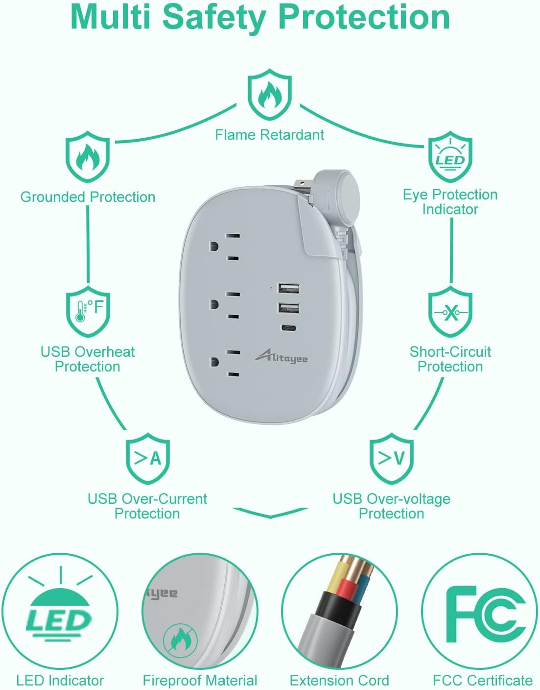 【Reliable Safety Guaranteed】This travel power strip with USB is certified by FCC , and made of Fire-resistant PC shell . Built-in short-circuit, over-voltage and over-current protection can ensure the safety.Our friendly and reliable customer service will respond to you within 24 hours. You can purchase with confidence, with our 30-day return and 18-month replacement
