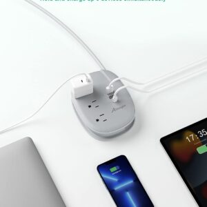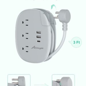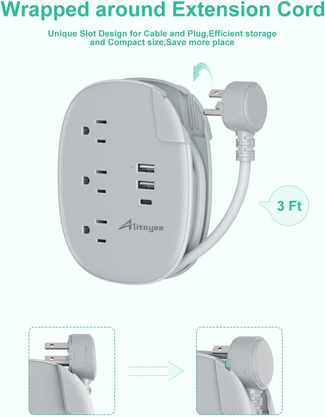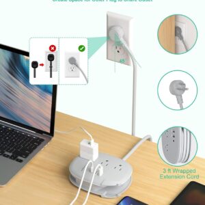 【USB Travel Power Strip with Wrapped Extension Cord】3ft retractable extension cord with 45-degree right angled flat plug, get easy access to place that’s hard to reach. The 3-prong grounded right angle flat plug keeps your other wall outlets free.better for on the desktop or nightstand