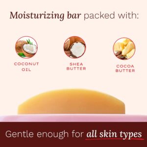 The moisturizing bar is packed with Coconut Oil, Shea Butter and Cocoa Butter for silky smooth skin.