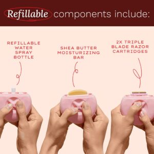 Refillable components include a water spray bottle, a Shea Butter moisturizing bar, and two triple-blade razor cartridges.