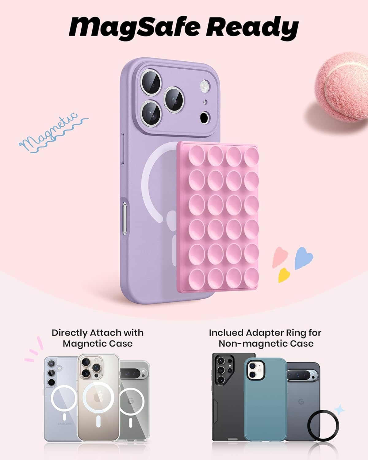 Compatibility Check: Work with iPhone 17/17 Pro/17 Pro Max, iPhone Air, 16/15/14/13/12 Pro Max/Pro/Plus/Mini and other phones with MagSafe cases. For non-MagSafe cases, just use the included magnetic adapter ring for secure attachment.