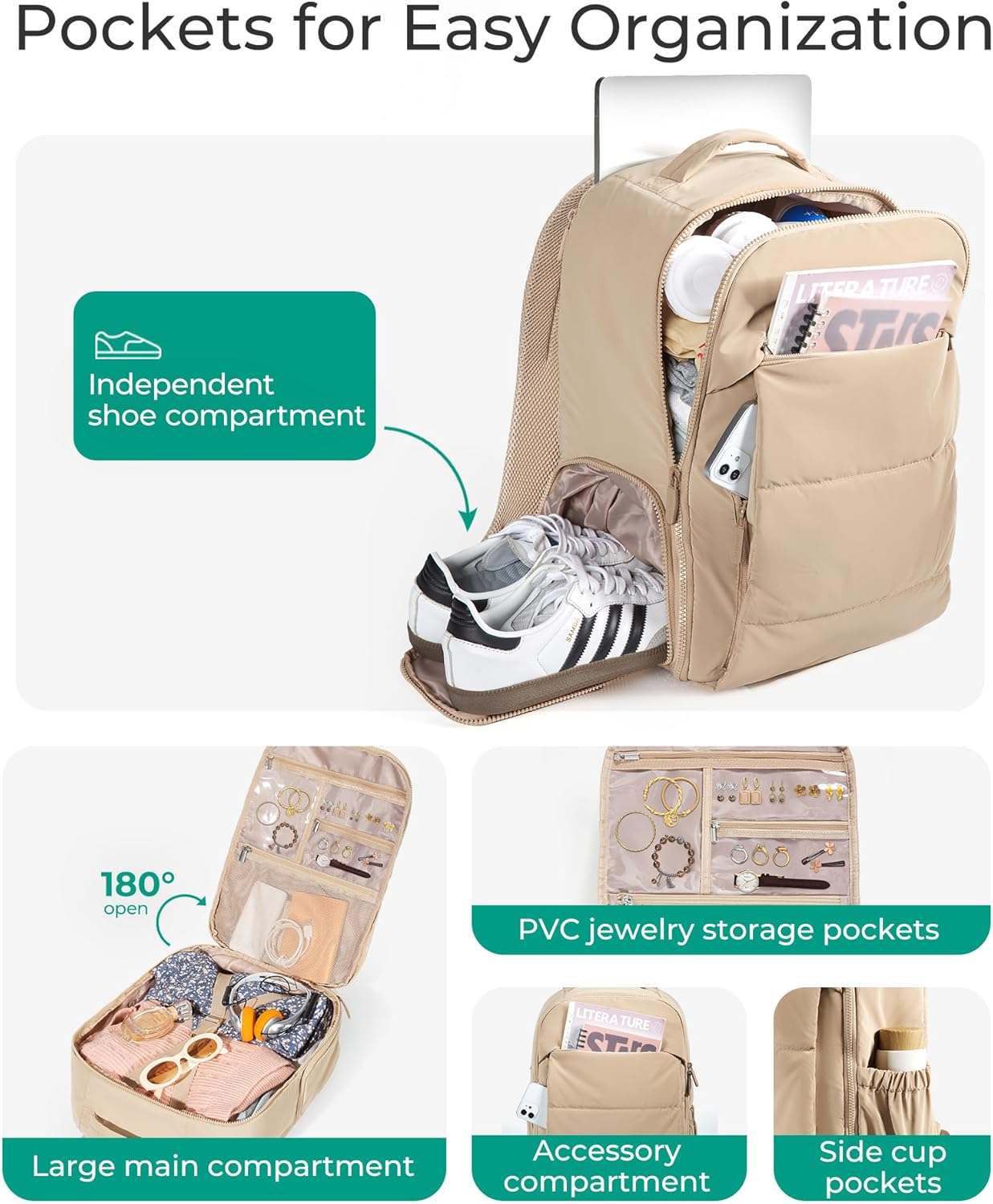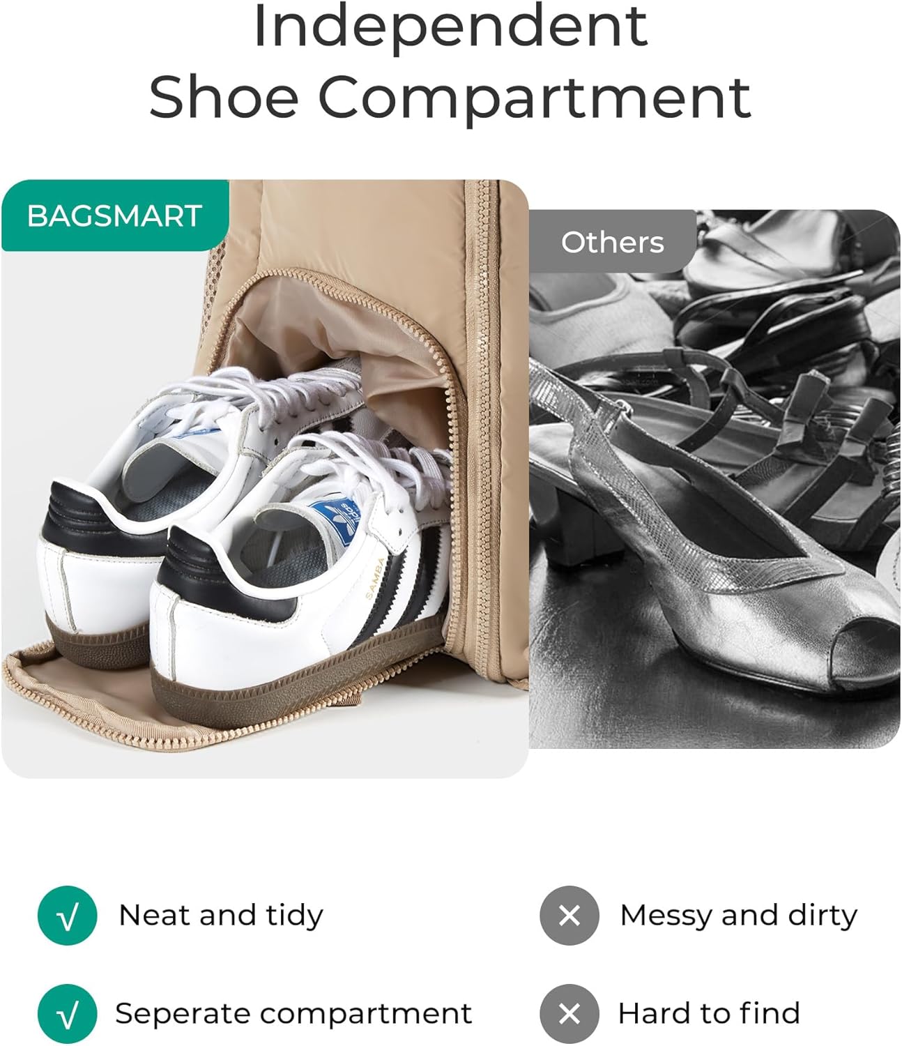 Practical Features: A separate shoe compartment on the side maintains cleanliness and organization. The Padded 15.6″ laptop compartment towards the backside, keeps electronics easy to access and provides reliable protection against impacts. Additionally, the back strap conveniently fits over a suitcase handle for effortless transport