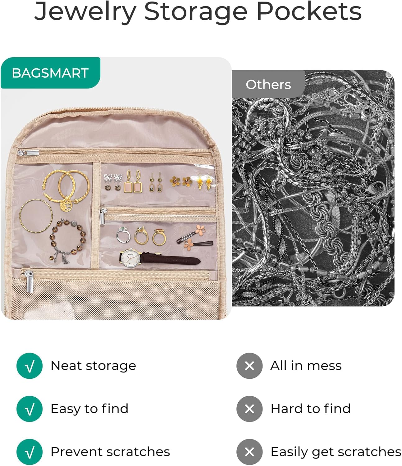 Jewelry Safekeeping: Our carry on bag offers PVC pockets for jewelry storing, different sizes transparent pockets keep your belongings separated and always find the jewelry you need. Bid farewell to rummaging through a chaotic bag
