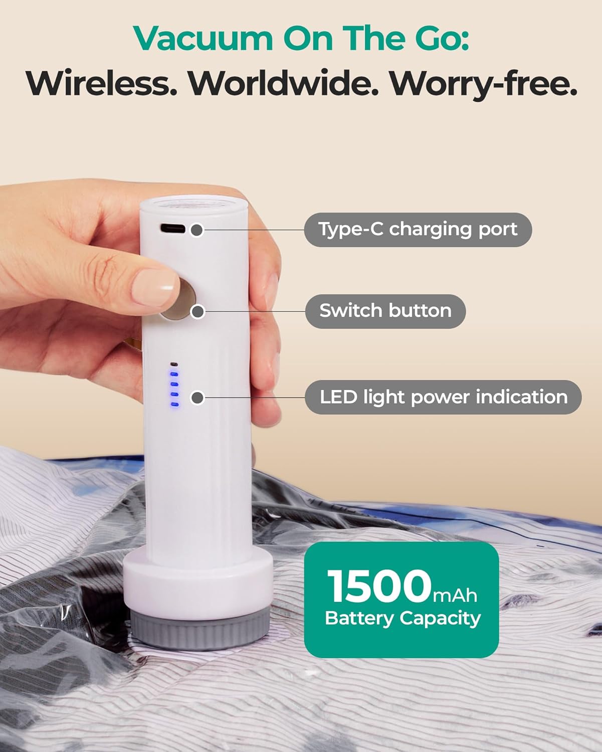 1500mAh Wireless Air Pump: No outlets needed—compress bags anywhere! Supports Type-C charging for seamless charging, worldwide compatibility.