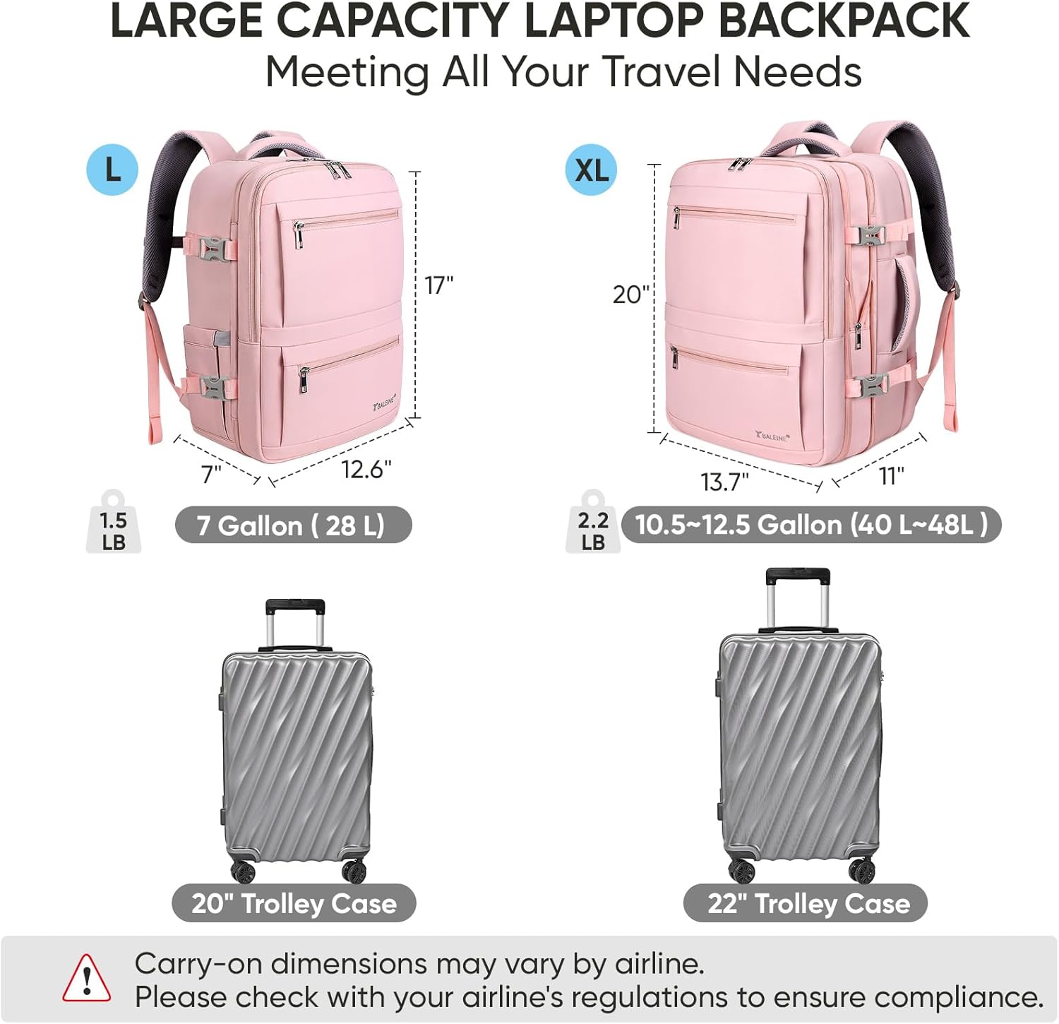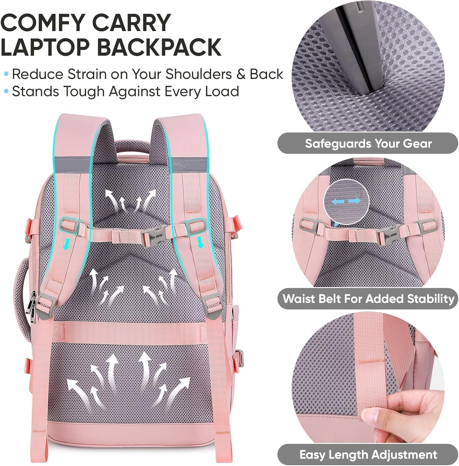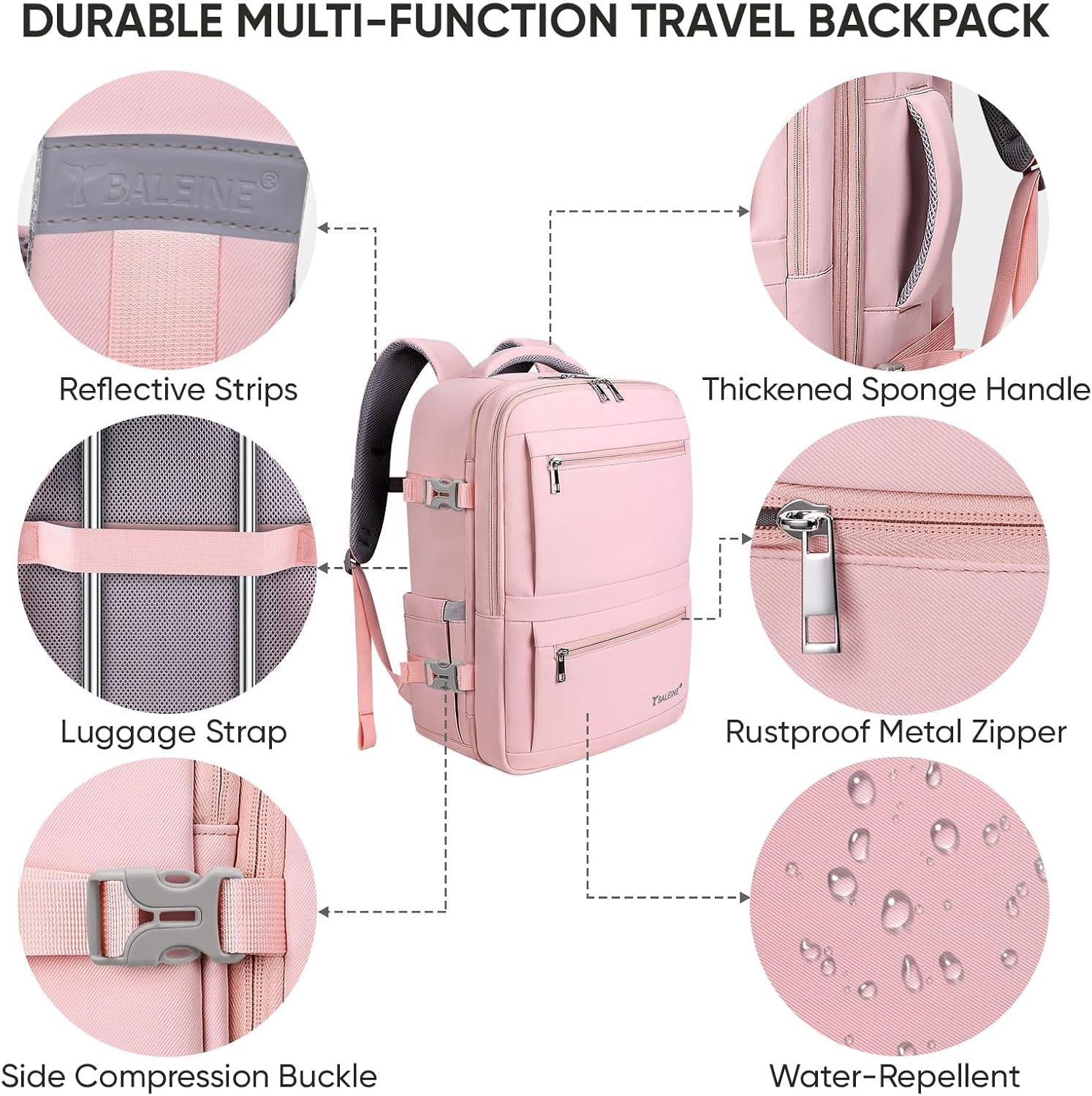 BALEINE Travel Backpack for Women Men, Large Sturdy Carry On Laptop Backpack Gifts for Business, Casual, Weekender, Hiking (Large, Pink)