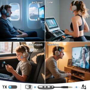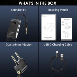 Wide Compatibility: The bluetooth transmitter for tv is super compatible. It works with AUX/RCA – output audio devices like those on planes, TVs, PCs, and gym equipment. It can connect to any headsets and earbuds (such as AirPods 1/2/3/Pro). The included dual 3.5mm adapter of the tv bluetooth transmitter enables it to be used on any flight, regardless of the connector type.