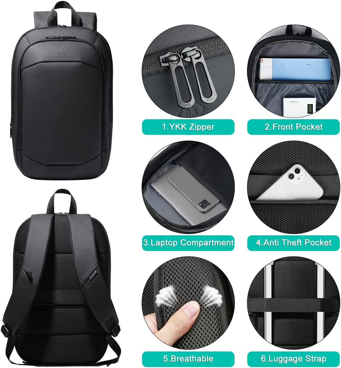 Separate Laptop Compartment:This laptop backpack for men Fits up to 17 Inch LaptopsMain Compartment: The slim backpack for men and women with large capacity for clothes, headset, books, magazine, camera, CD’s, etcFront Compartment: For Phones, pen, keys, wallet, purse, glasses and other small itemsAnti-theft Back Pocket: Passport, Cellphone, Wallet, Earphone
