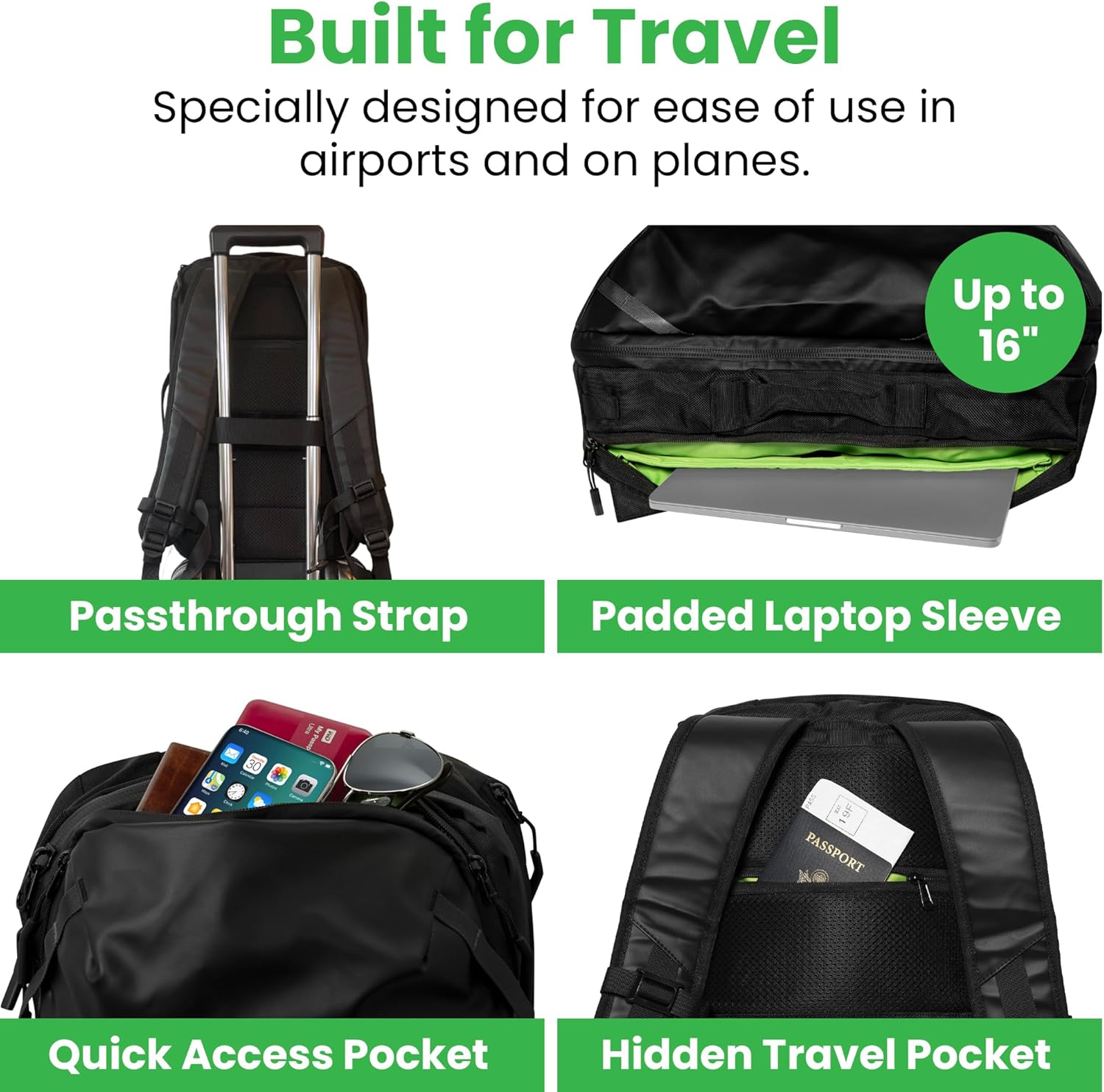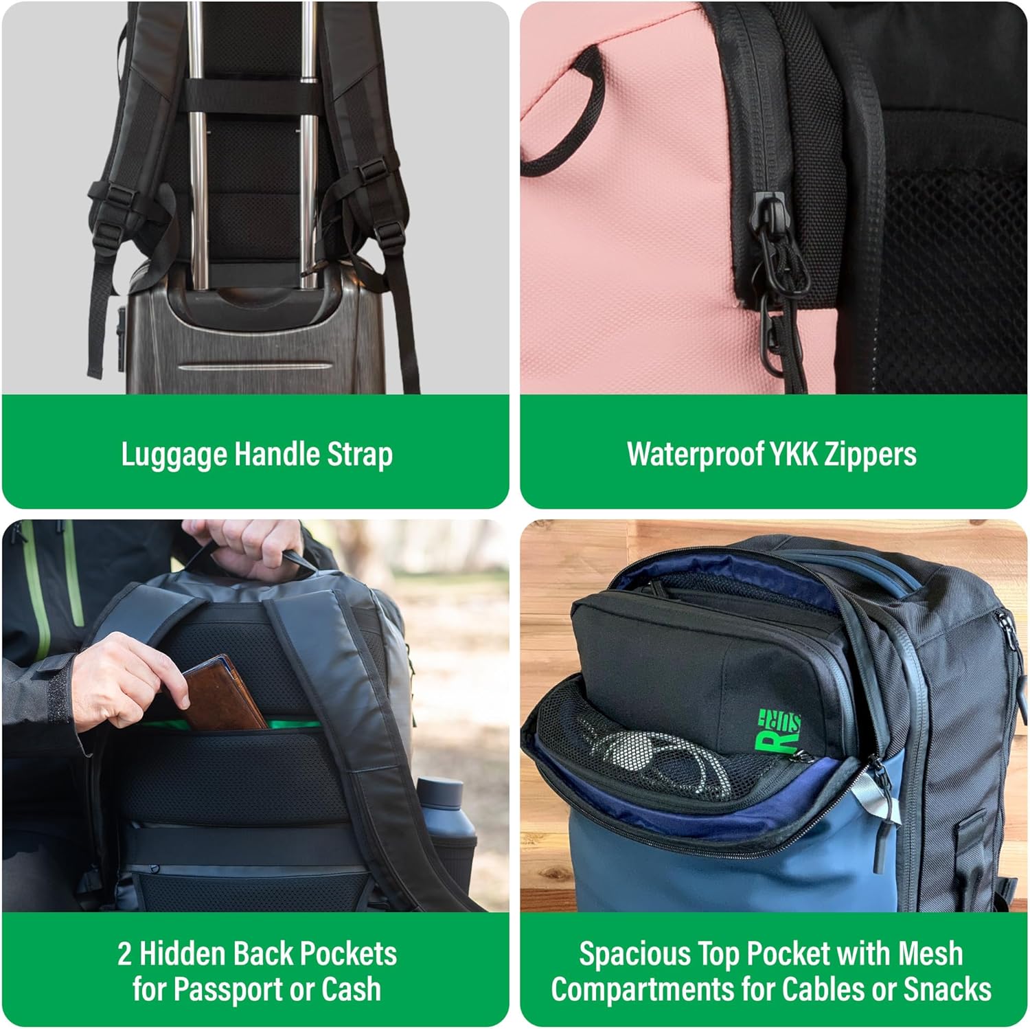 Two hidden pockets on the back panel for travel documents, money, credit cards, or whatever you don’t want the pick-pockets to find. One zipper is hidden under the carry-on luggage handle sleeve and not visible to the eye.