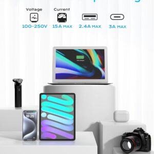 【9-in-1 USB-C Power Strip】 All-in-one power strip provides 6 widely spaced outlets, 2 USB-A ports, and 1 USB-C port, charging 9 devices simultaneously.