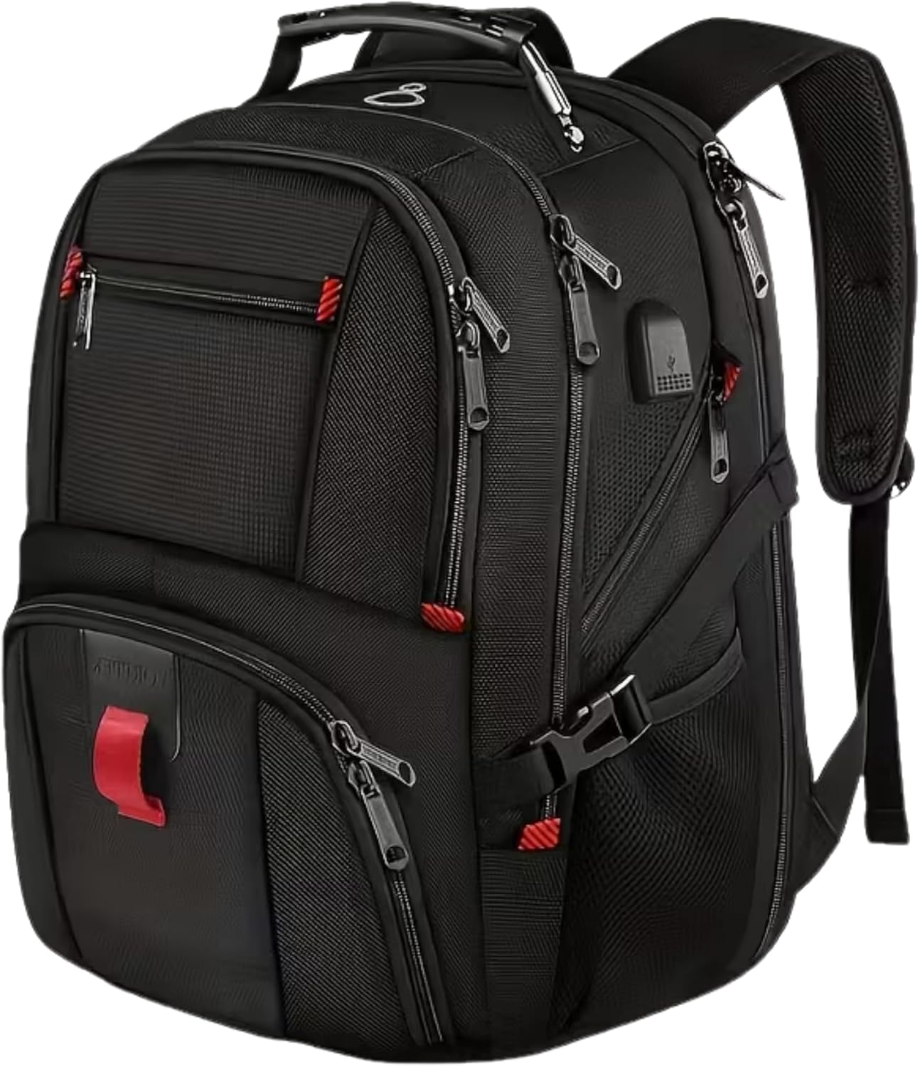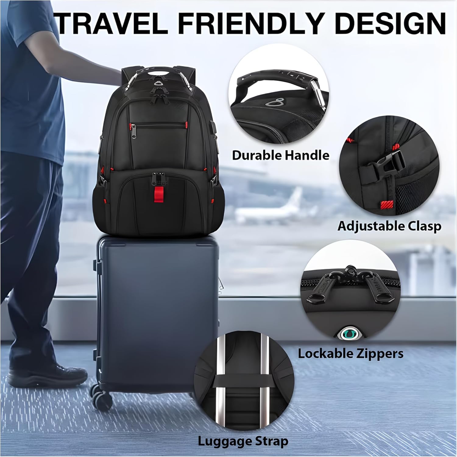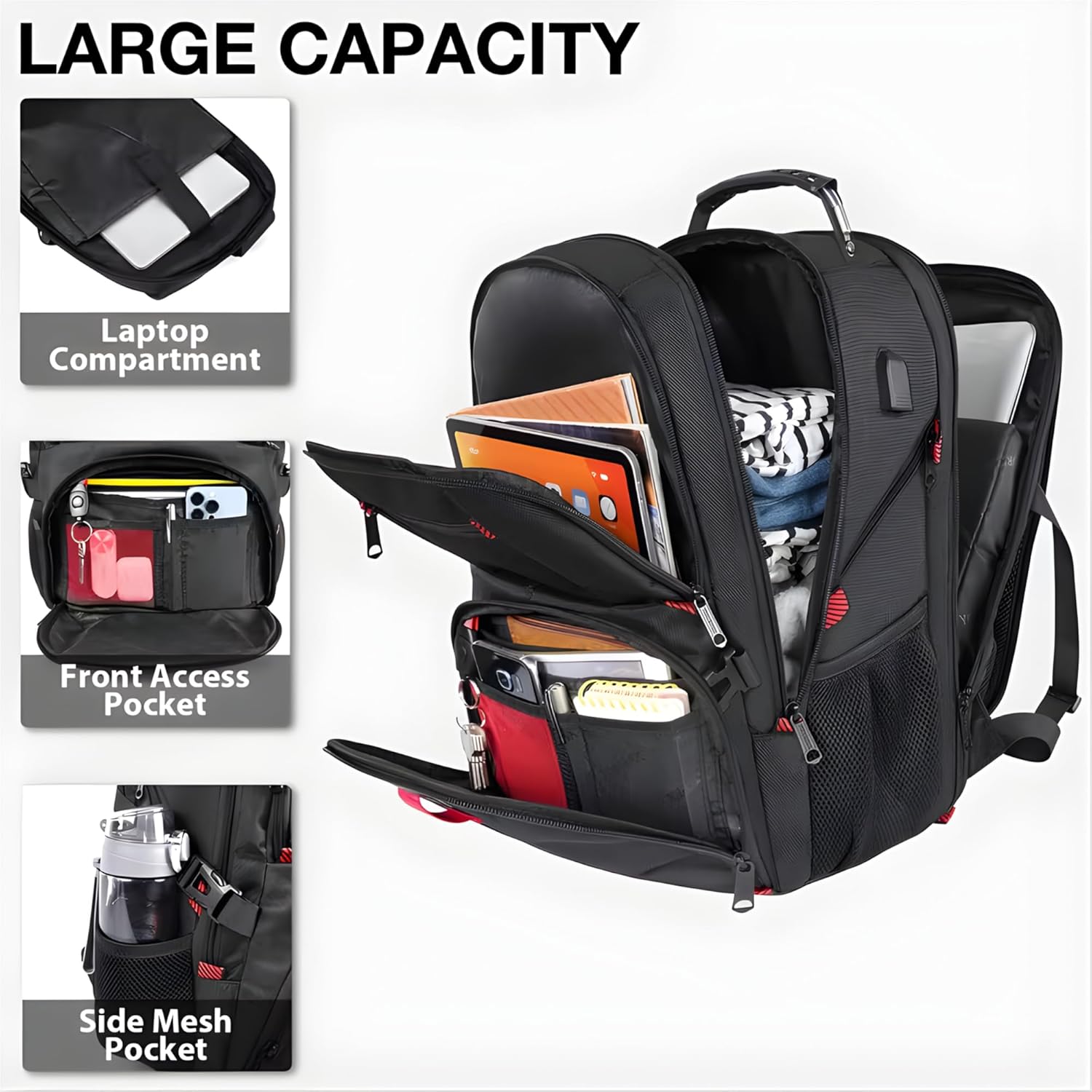 This extra large travel laptop backpack is designed for professionals, students, and travelers who need reliable storage, organization, and comfort. With a 13.2-gallon capacity, it easily fits clothing, books, accessories, and daily essentials while keeping everything organized with multiple compartments. The padded laptop sleeve fits laptops up to 17 inches, helping protect your device during work, school, or travel. Its airline-approved carry-on design makes it a practical choice for flights, business trips, and daily commuting. Featuring a built-in USB charging port, this backpack allows you to charge your phone or devices conveniently while on the move (power bank not included). Adjustable padded shoulder straps and a breathable back panel help reduce strain during extended wear. Ideal for work, office, college, travel, and everyday use, this backpack combines functionality, comfort, and durability in a sleek black design suitable for both men and women.