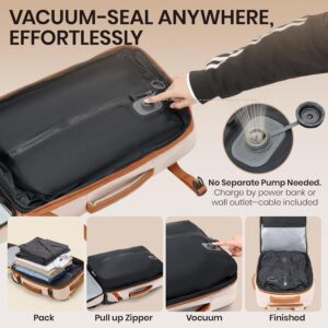 All-In-One Design: The vacuum backpack utilizes a single vacuum compression system which merges pump and compression—no separate parts, eliminating loss or compatibility issues.How to use? Lay compressibles (eg.clothes) flat in the vacuum travel backpack. Zip shut completely. Press your palm evenly along the seam to prep for max efficiency. Hold the vacuum button ~2 seconds; once compressed, press again to power off. Seal the cap tightly on the open end. Simple, space-saving, and hassle-free