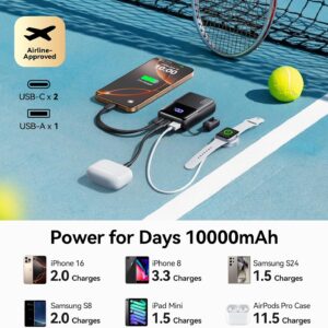 Power for Days 10000mAh: If you’re looking for a power bank that covers daily use, short trips, and business travel, 10,000mAh is the perfect choice. It can charge your iPhone 16 twice, your Samsung S24 1.5 times, and your iPad mini 1.5 times.