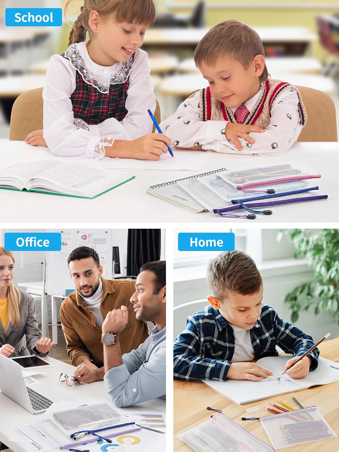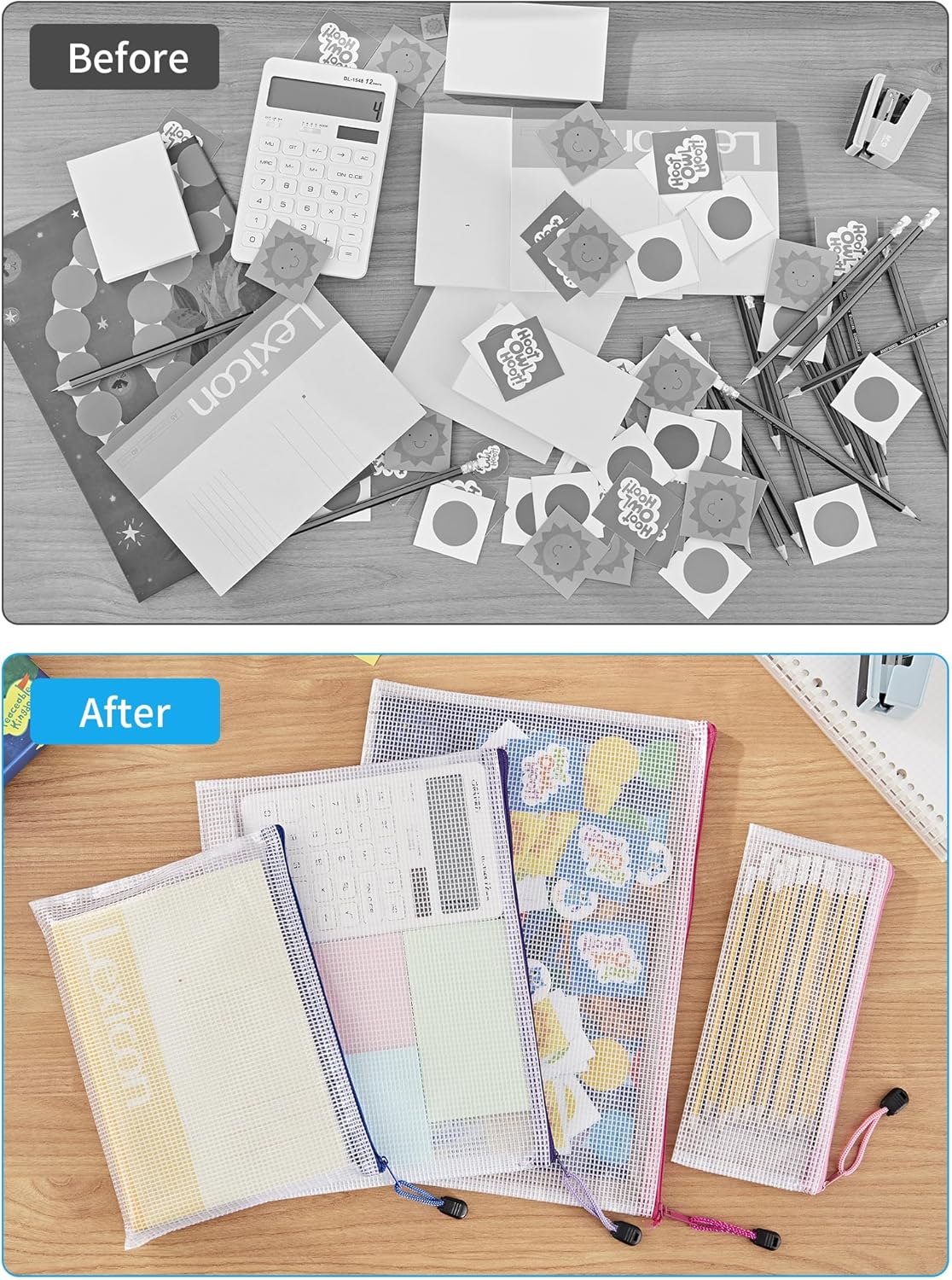 Advantages: The translucent design and colorful zipper allow identifying items. Suitable for use in homes, schools, colleges, offices, and travel, can be used to organize books, paper, bills, photos, cosmetics, toys, etc.