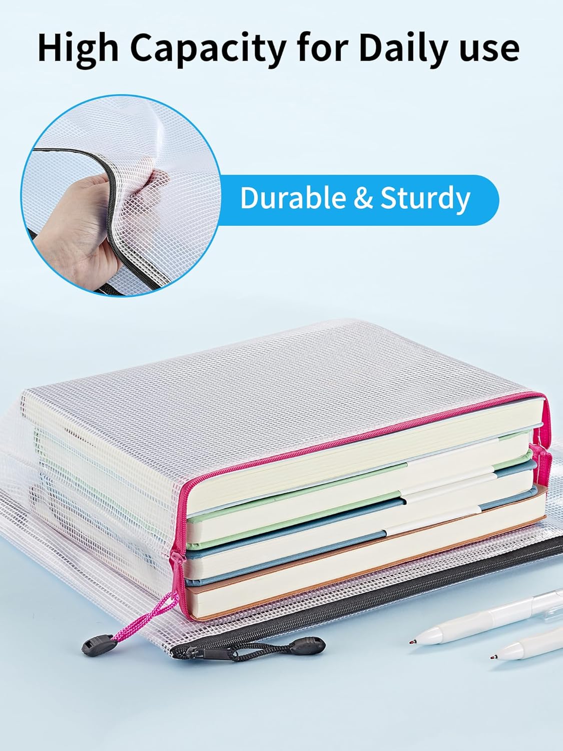 18 Pieces Zipper Bags – The package includes 18pcs zipper mesh pouches in 8 sizes. They are 2*B4 (15×11 inches), 2*A4 (13.2×9.4inch), 2*B5 (11.6×8.3 inches), 2*A5 (9.4×6.9 inches), 2*B6 (7.7×5.5 inches), 2*A6 (7.3×4.5 inches), 4*Bills (9.4×4.3 inches), 2*B8 (5.1×4.1 inches).