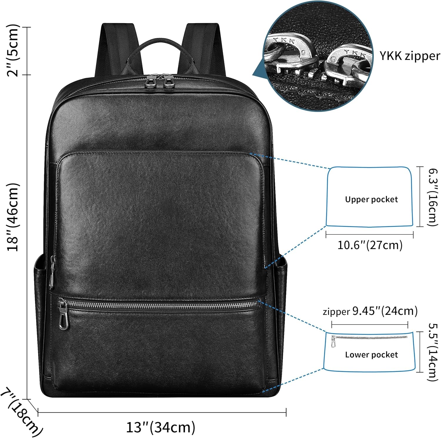 【High quality top layer cowhide】The genuine leather business backpack fabric is made of high-quality imported Italian top layer cowhide, and the unique pore texture of the leather is clearly visible. The interior is made of black silk lining, which is durable and long-lasting. The hardware is Japanese YKK brand zipper. High strength nylon suture thread, neat and neat in routing. This backpack is exquisitely crafted and durable, with a normal lifespan of over 8-10 years