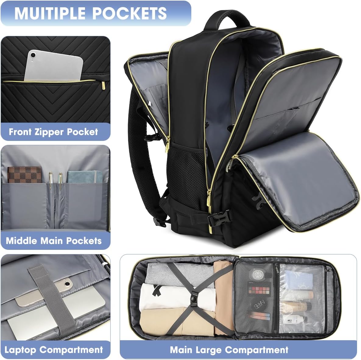 Large Capacity Travel Backpack – This extra large backpack offers more packing capacity up to 40L for your travel. Main compartment has enough storage room to store 8 to 10 clothes and daily necessities. It also has built-in elastic bands to keep your clothes from falling out. The TSA 180 degree double zipper closure helps you go through the security check quickly. This travel backpack is the best choice for women and men’s vacation, weekend getaway, overnight and bussiness trip.