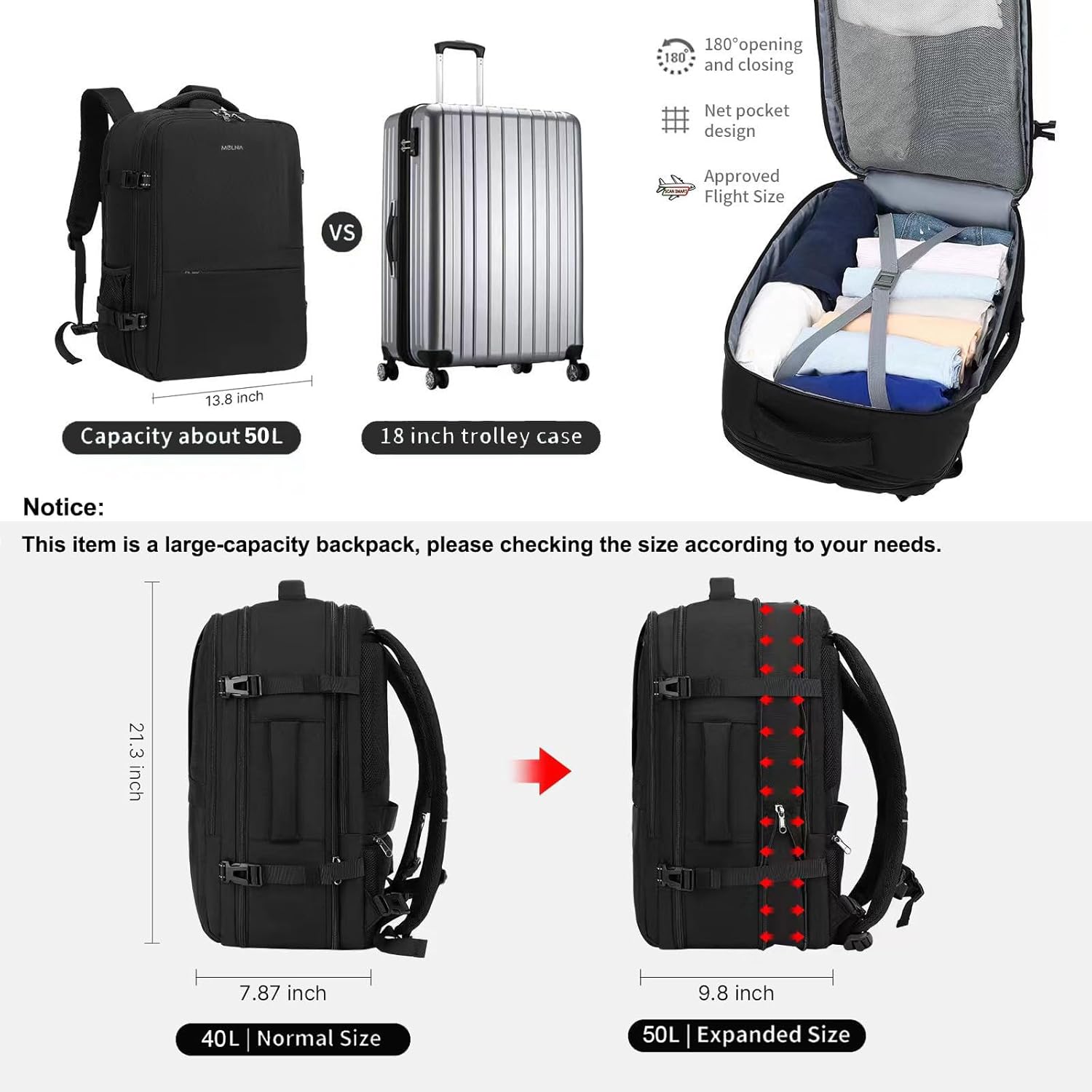 ✈50L Extra Large EXPANDABLE & FLIGHT APPROVED: Only Simply unzip, you could get 2 inches of expansion space, Molnia travel backpack offers you more packing capacity up to 50L, for your 3-7 days of travel gear. Without expansion, our carry on backpack meets the maximum size allowed for most IATA flights and also fits in the overhead compartment and under the seat in flight.