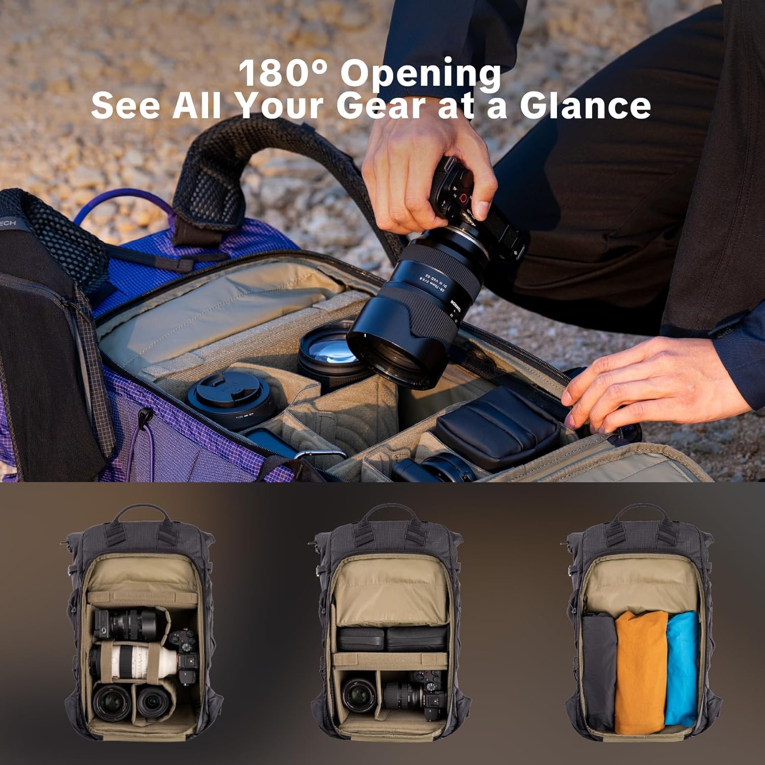 【180°opening & Side Access】The full-access rear panel provides maximum visibility and easy access to all your gear. Get your camera through the left side access window in seconds without taking off the backpack.