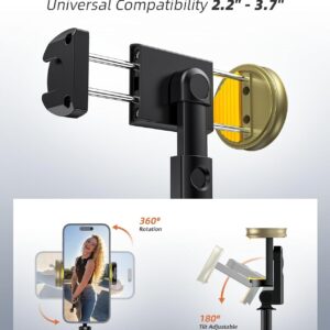 Adjustable Height and Flexible Shooting: Our iPhone tripod can extend up to 62 inches and features an upgraded 360° rotating phone holder. It allows for flexible angle adjustments and easy capture of wider views, adapting to different shooting scenarios to ensure you always get the perfect shot.