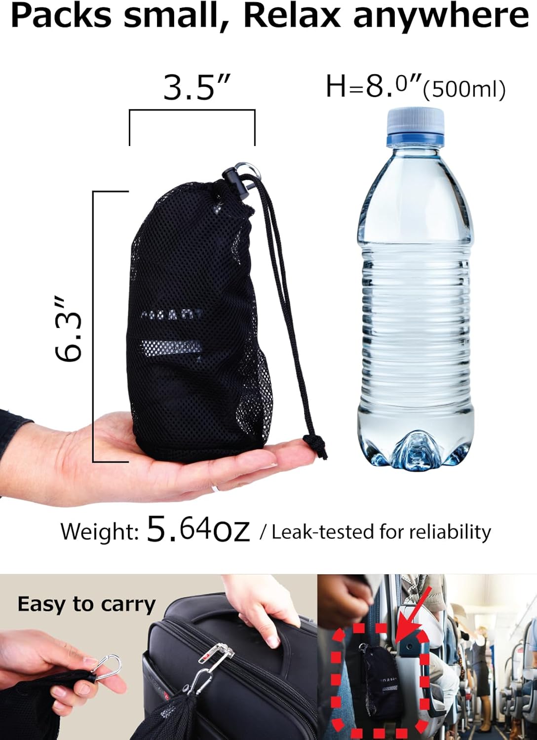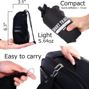 ULTRA-COMPACT AIRPLANE BACK PILLOW FOR TRAVEL: Weighing just 5.64 oz, it deflates to 3.5″ × 6.3″ and packs easily into carry-ons or backpacks. Best comfort at 60–70% air (approx. 13.8″ × 7.9″ × 3.7″)—perfect for long flights and on-the-go support.