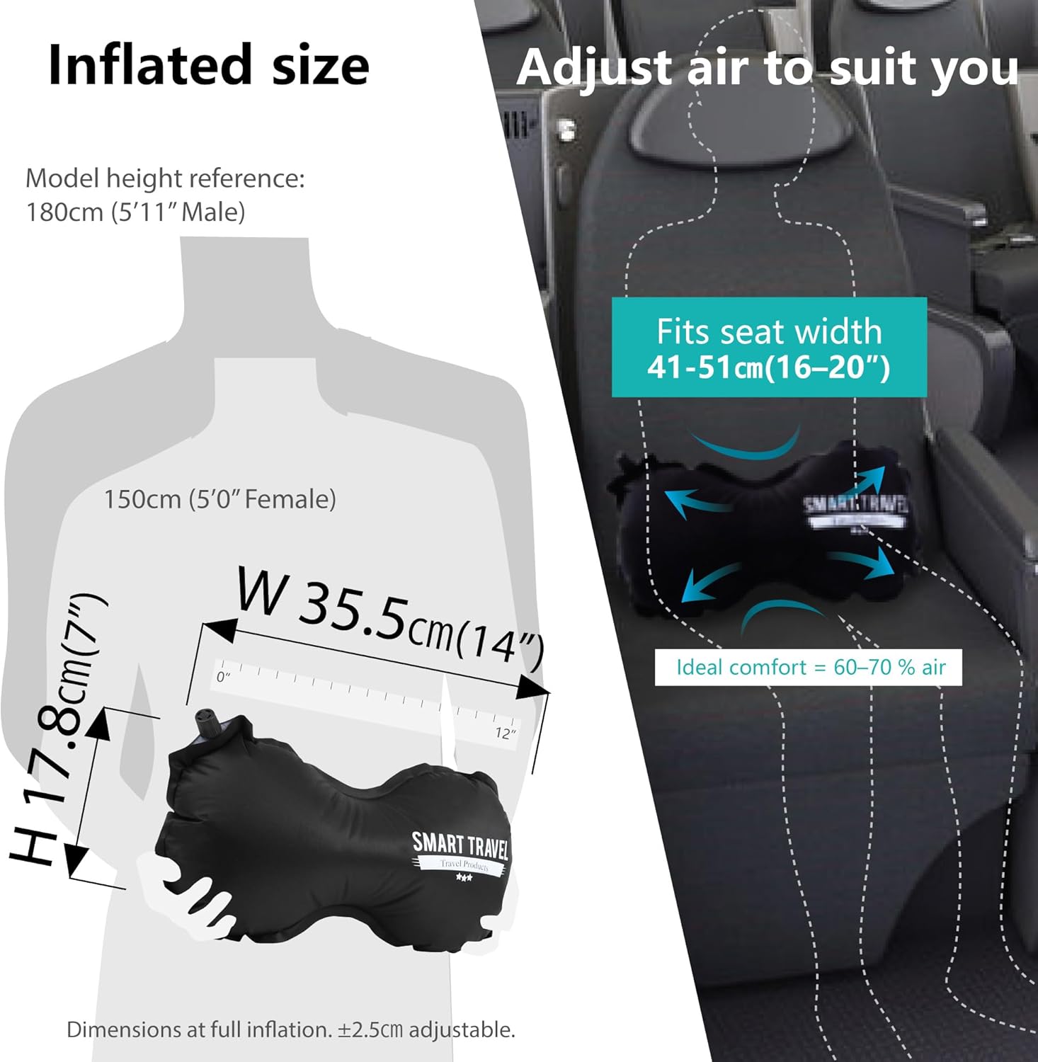 ERGONOMIC BACK SUPPORT FOR LONG SITTING: Our 3D inflatable lumbar pillow gently supports your lower, mid, or upper back. Balanced pressure distribution helps reduce discomfort and encourages natural S-curve alignment for better posture during long flights, commuting, or desk work.