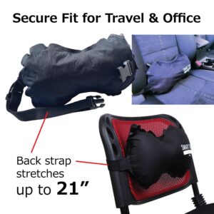 ADJUSTABLE STRAP THAT STAYS PUT: The adjustable band secures the pillow to an airplane seat, office chair, or car seat to reduce slipping. Get consistent travel lumbar support during flights and long sitting—without constant readjustment.