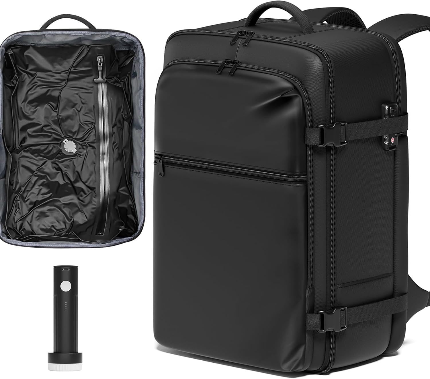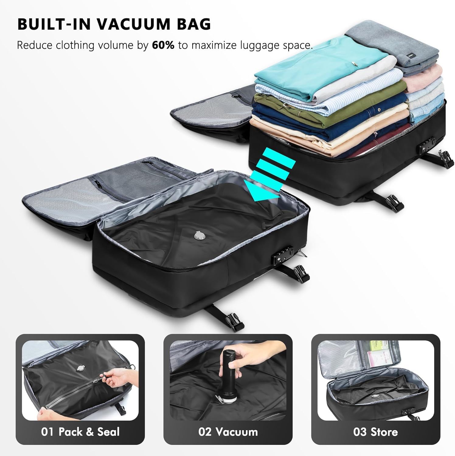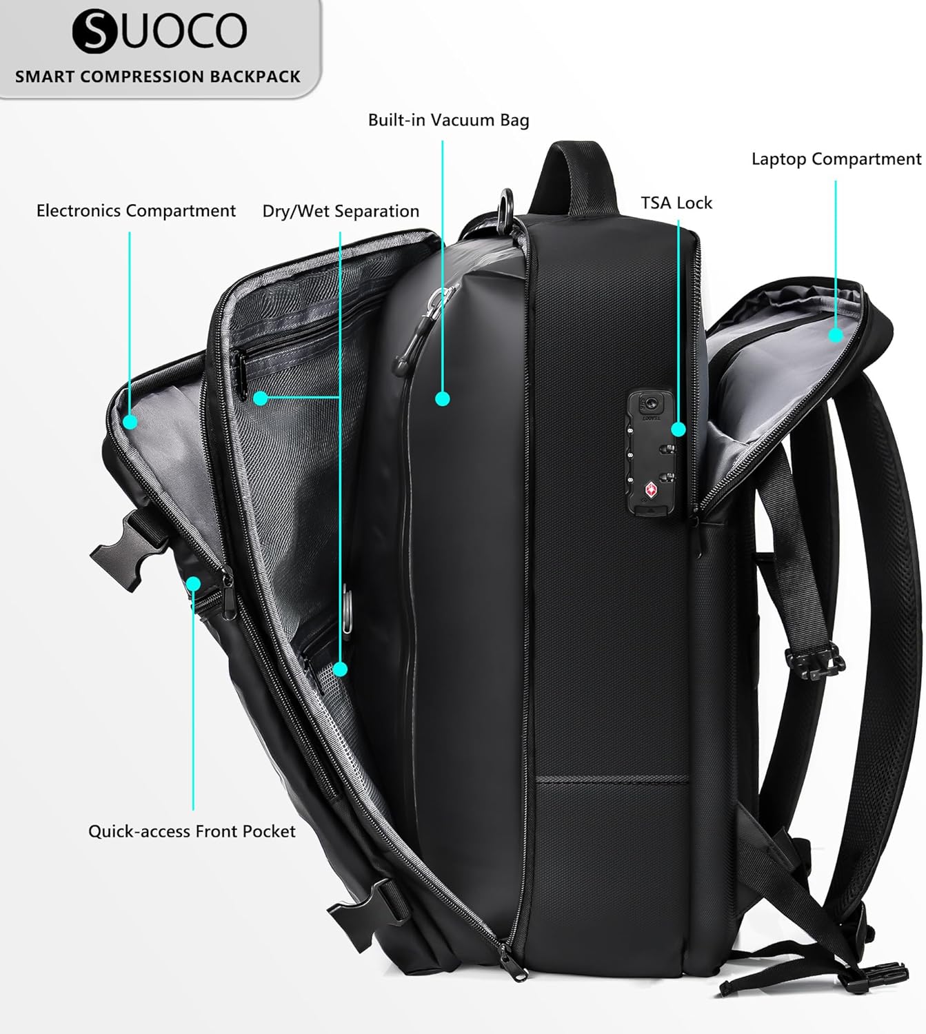 Vacuum Backpack for Travel: The SUOCO Backpack features a built-in vacuum-compression bag that allows you to pack up to 60 liters of clothing—far more than a 20-inch carry-on can hold. This breakthrough in travel convenience and storage efficiency lets you fit maximum capacity into a compact form, so you never have to compromise on what to bring. A wireless electric travel pump is included to compress everything in just 10 seconds.