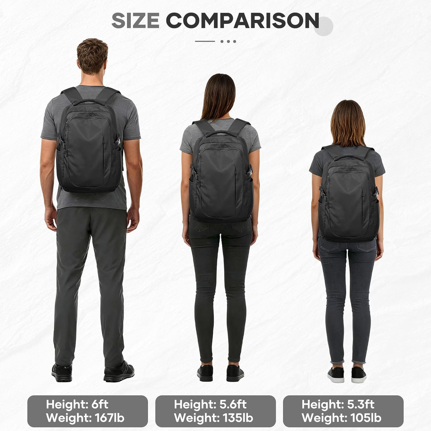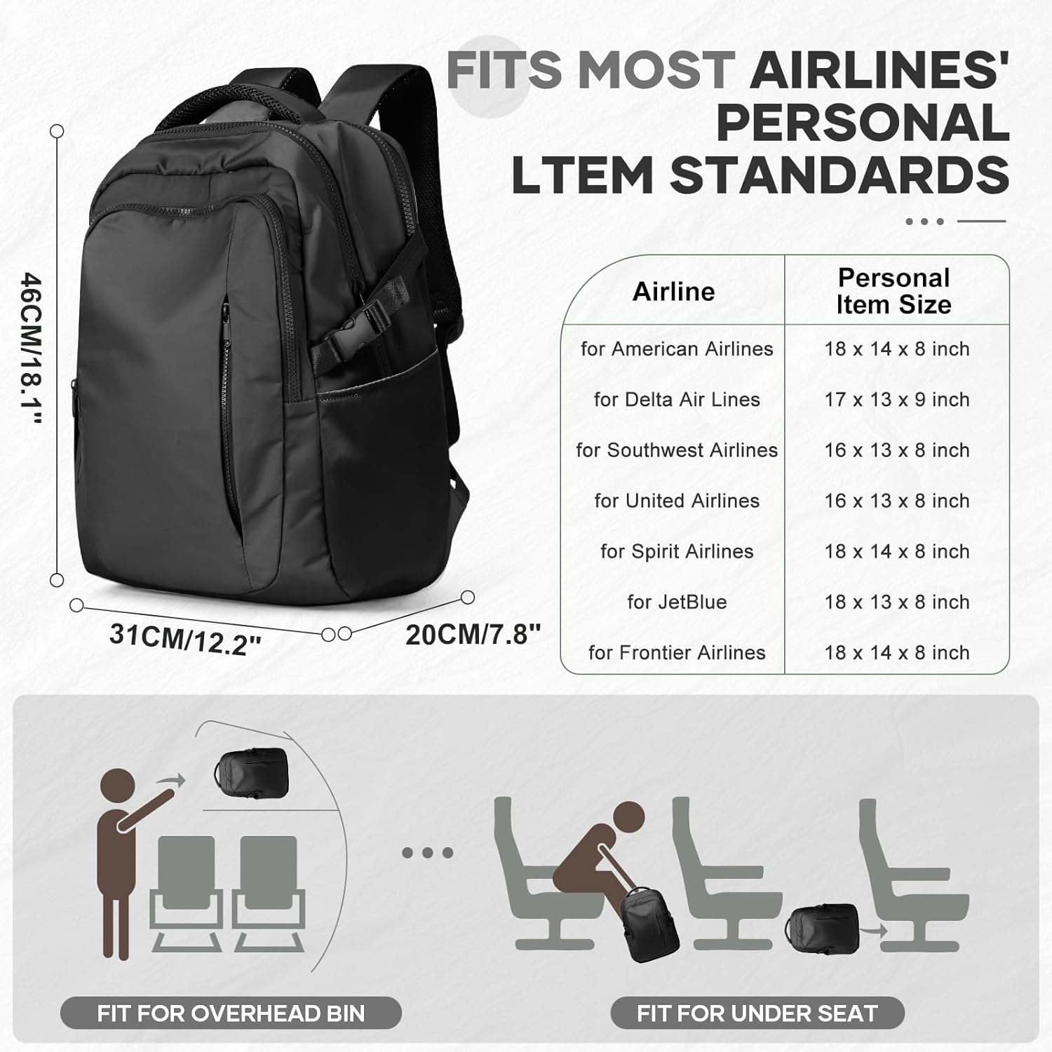 Travel Backpack Carry On Flight Approved: Worried about backpack size? This travel backpack, sized at 18.1″ x 12.2″ x 7.8″, weight 1.47 LB, is designed to meet the personal item dimensions (typically 18″ x 14″ x 8″) of major airlines like American, Delta, and United. It conveniently slides under the seat in front of you, helping you move through the airport smoothly and avoid unexpected gate-check fees