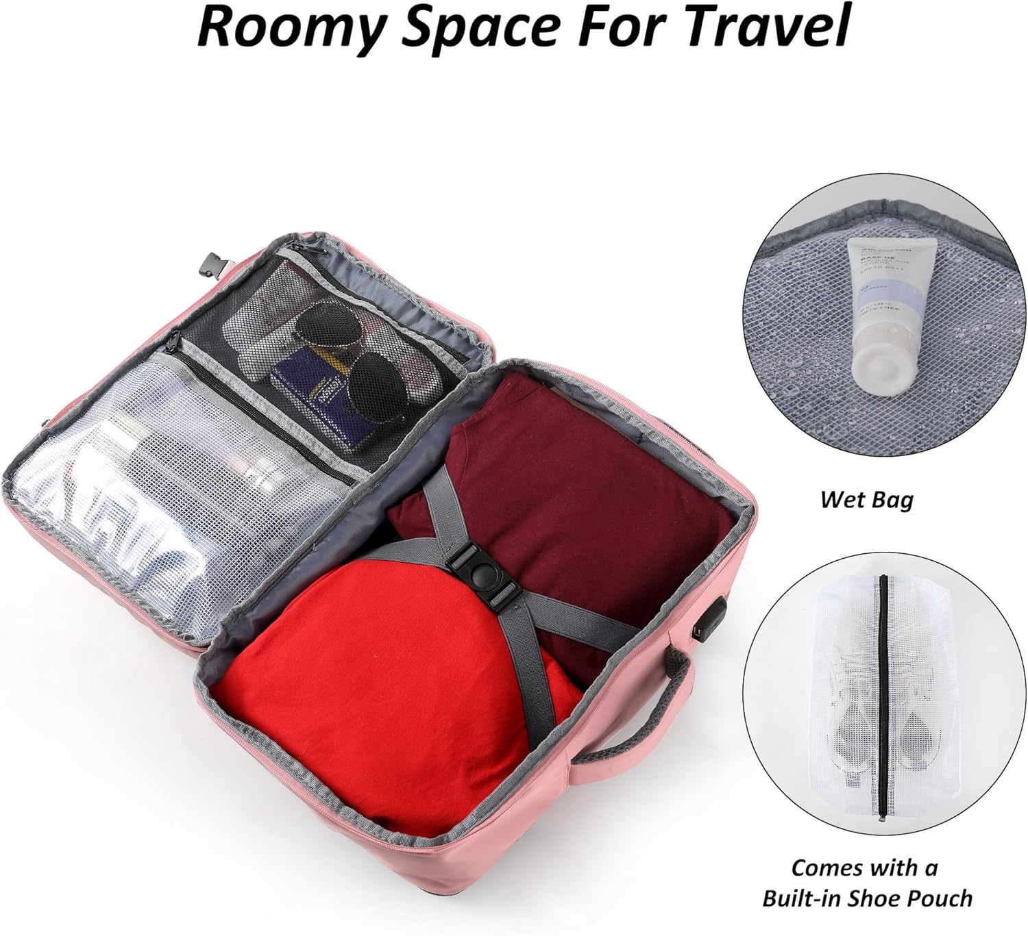 【Water-Resistant & Practical】Crafted from lightweight, water-repellent material, the small travel backpack resists spill. Includes a wet pouch, shoe compartment, easy to clean