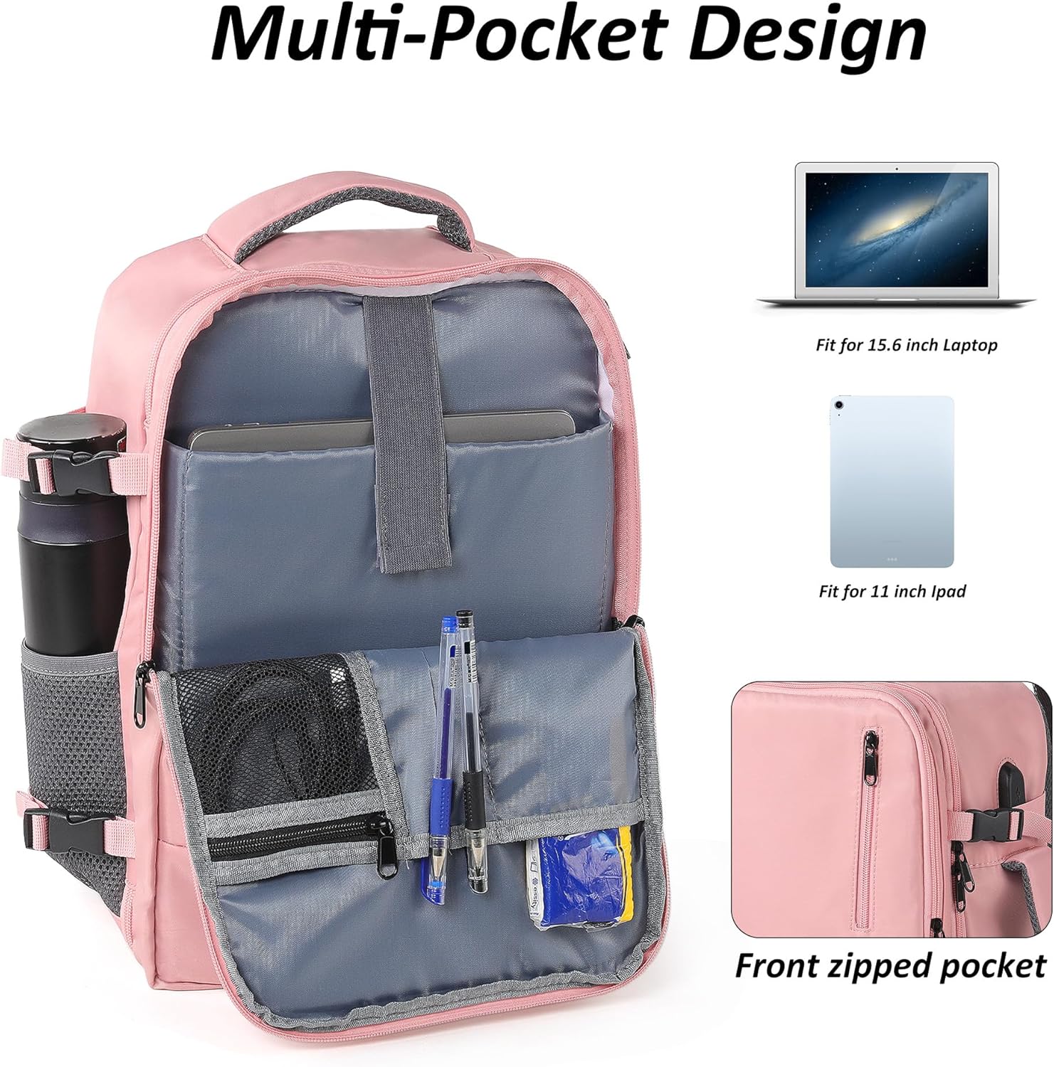 【Flight-Approved】The laptop backpack (15.74″*10.62″*6.69″) fits under airplane seats and overhead bins. Includes a luggage strap and 180 degrees-open zip for smooth security checks