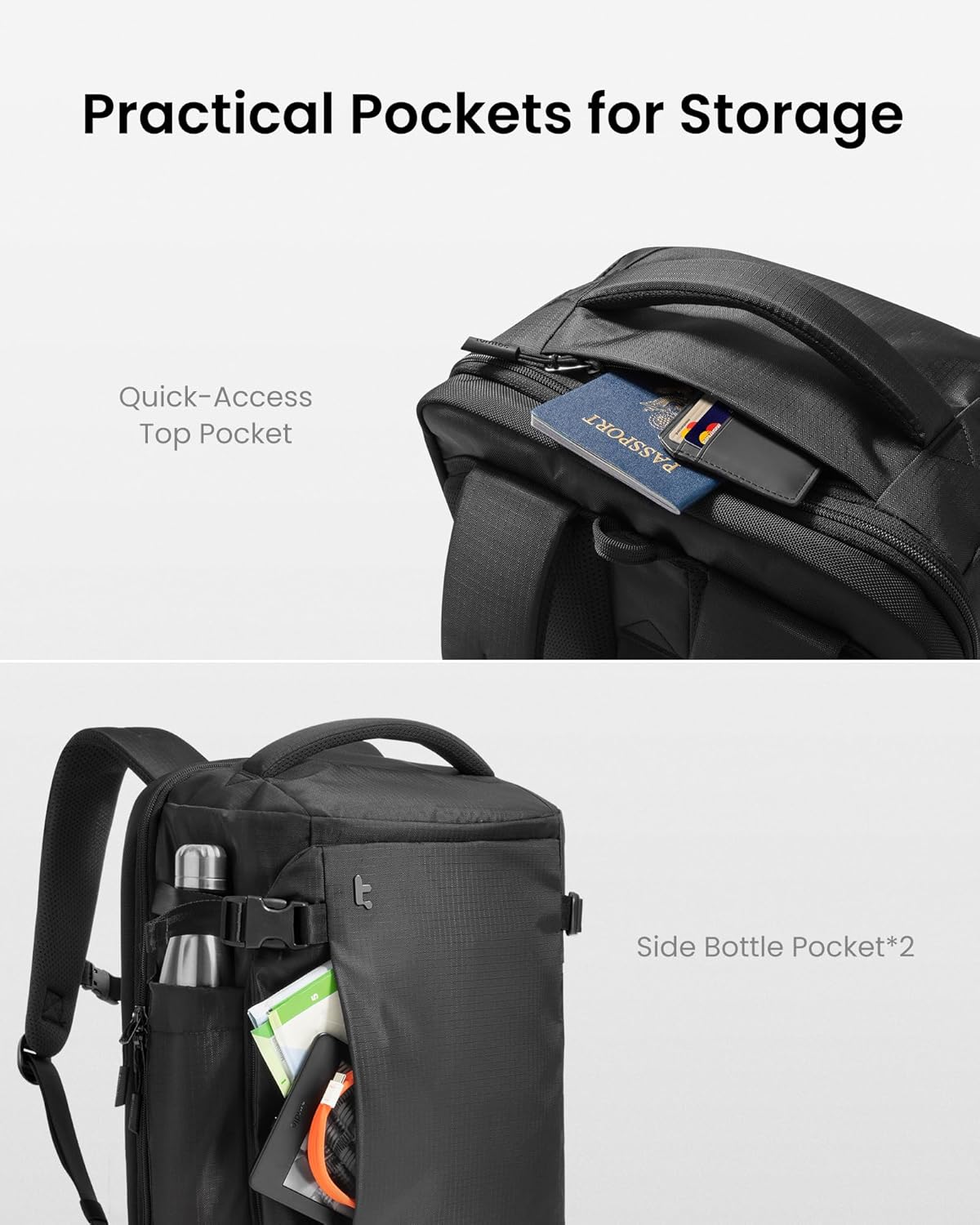 Smart Organization: Features a clamshell-style main compartment for suitcase-like packing, a dedicated tech compartment that fits a 16″ laptop and 13″ iPad, a quick-access front pocket for essentials, a top pocket for sunglasses or small items, and side pockets for bottles or travel liquids—everything stays exactly where it belongs
