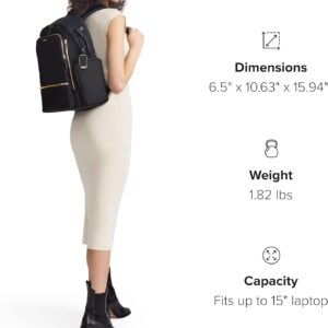 Double-zip entry to main compartment| Zip entry to padded laptop compartment (fits up to a 15” PC or 16” MacBook screen)| Leather top handle| Front U-zip pocket| 2 front zip pockets| Front zip entry to main compartment| Side zip pocket