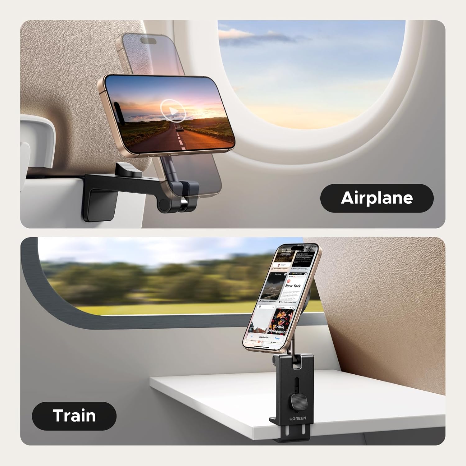 Universal Wide-Grip Clip: the clamp distance of this airplane phone holder is 8-25mm. Securely mounts on plane trays, kitchen cabinets, camping or coffee tables etc. Perfect for travel, home, and outdoor use