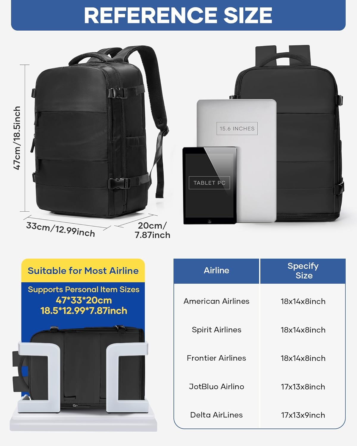 Large-capacity backpack:The size of this backpack is 47*33*20CM.This large backpack features a spacious main compartment that can hold daily necessities such as clothes, toiletries, skincare products, etc. The front compartment is equipped with many small pockets and a pen case design to keep your items neat and organized. There is a separate laptop compartment that can fit a 15-inch laptop.