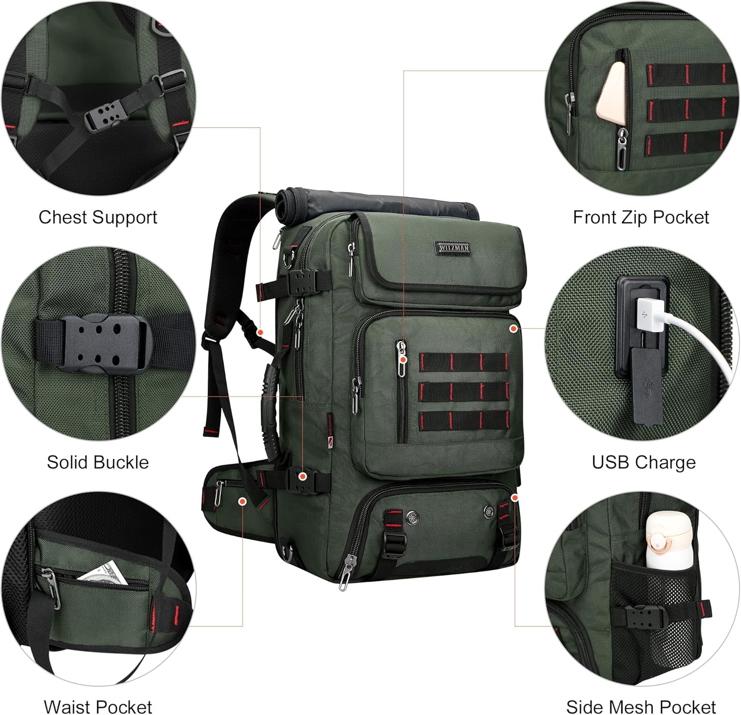 Multifunctional Carrying On Backpack: This men rucksack come with an adjustable and removable shoulder strap, can be used as a duffel bag. Versatility pocketto keep your items organized and easy to find. Suitability travel partner for men women who like international travel, camping,overnight trip.