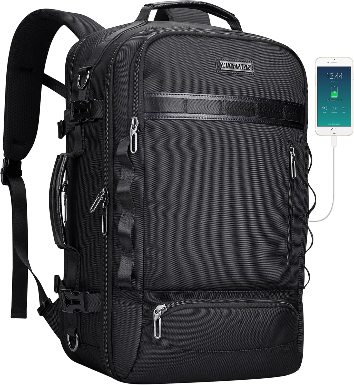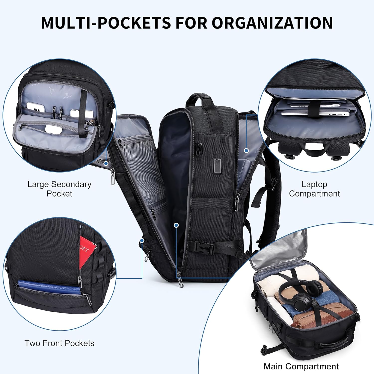 Multi Pocket Design & Laptop Compartment: External: 3 front pockets, 3 back zip pockets, 1 main compartment, 1 large zip pocket, 1 hidden security pocket, and 2 side pockets. Internal: 4 closed zipper pockets, 5 open pockets, 1 dedicated portable power bank pocket, 2 pen slots, and a key leash. A dedicated laptop compartment fits a 16″ laptop and 11″ iPad, equipped with a lockable anti-theft zipper. Below lies a concealed zip pocket for discreet storage of passports, cash, and valuables