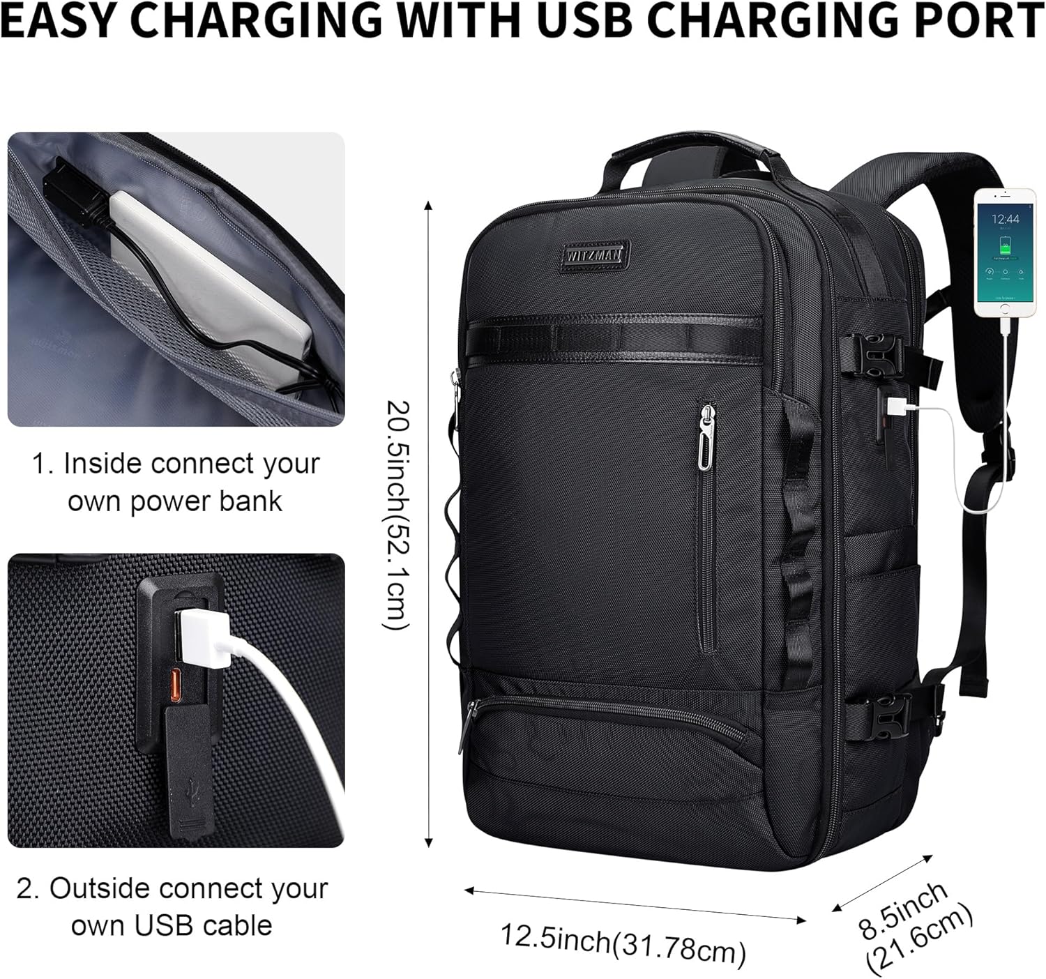 Dimension & Practical Design: L: 12.5 x W 8.5 x H 20.5 INCH/ L: 31.8 x W 21.6 x H 52.1 CM; Weight: 1.9kg(4.2lbs); The main compartment opens a full 180° for easy packing and complete visibility. Inside, a waterproof wet pocket keeps your toiletries separate, while built-in cross-compression straps secure and compact your load. Externally, a dual-port USB charging interface offers versatile charging options