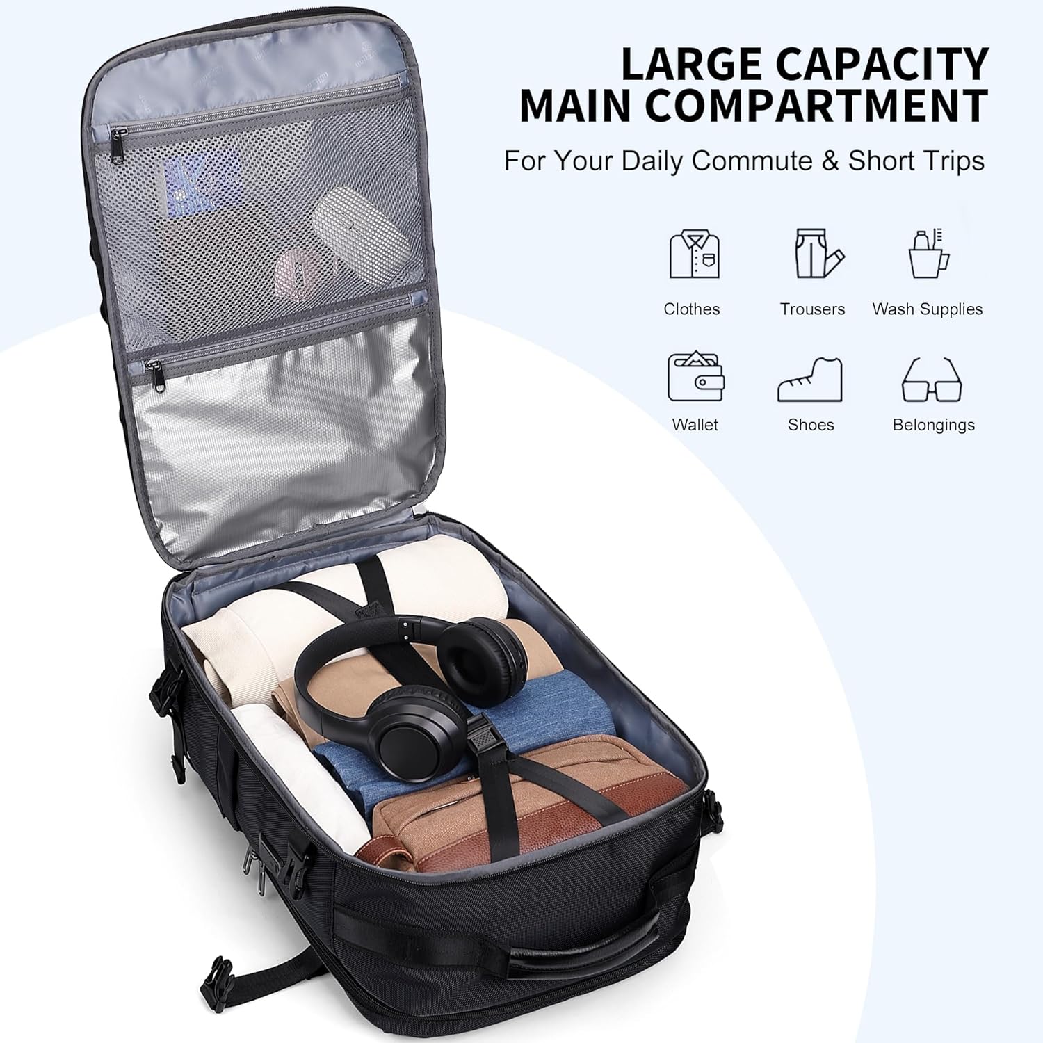 Multi-Scene Usage: This backpack is your ideal carry-on for flights. Its back panel features a luggage strap that securely anchors to your suitcase handle, freeing your hands and back for a smoother journey. It effortlessly adapts to a wide range of activities, making it the perfect choice for daily commutes, business trips, campus life, hiking, cycling, short camping trips, weekend getaways, and other short journeys